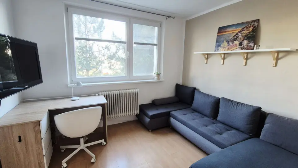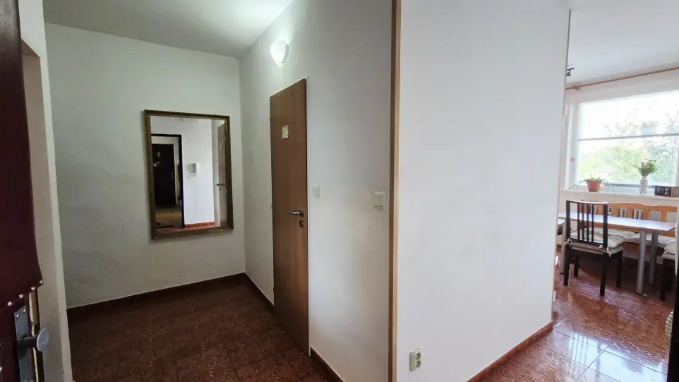 Byt pozostáva z veľkej vstupnej chodby (priestor na vstavanú skriňu), spálne, obývačky rozdelenou na dennú a nočnú časť, priestrannej kuchyne so vstupom na balkón a kúpeľne s vaňou a WC. Staršia rekonštrukcia bytu, byt má nové plastové okná s vnútornými žalúziami, zrekonštruovaný balkón, dlažba predsieň a kuchyňa, plávajúca podlaha spálňa a obývačka. Byt je orientovaný kuchyňa a obývačka na východ, spálňa na západ.