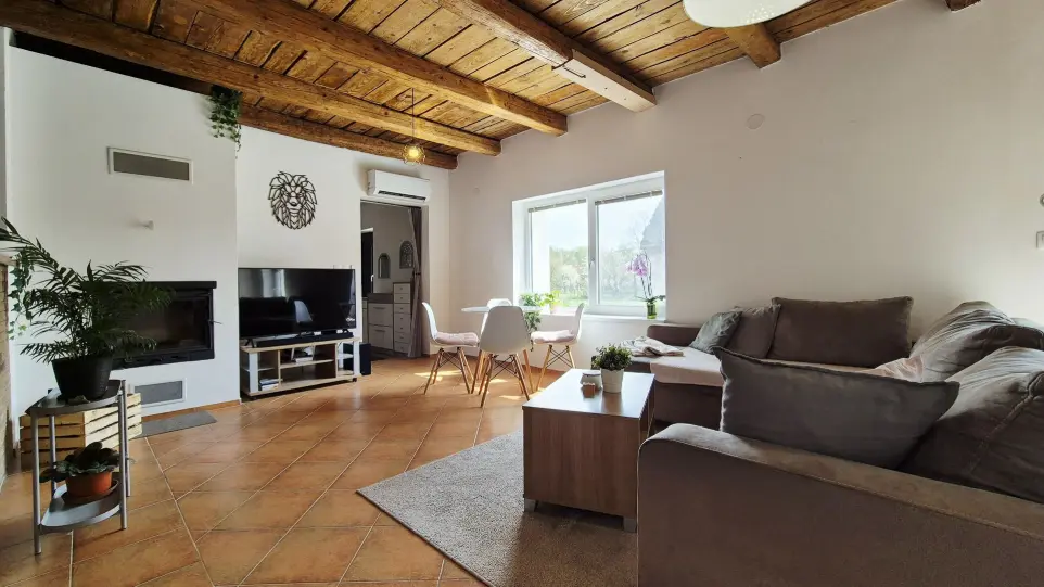 Dom pozostáva z predsiene, priestrannej obývačky s murovaným krbom prepojenou s kuchyňou a jedálňou a priamym vstupom na terasu, dve spálne, kúpeľne s vaňou a toaletou. V jednej spálni je šatník. Dom má povalu, ktorá poskytuje úložný priestor.